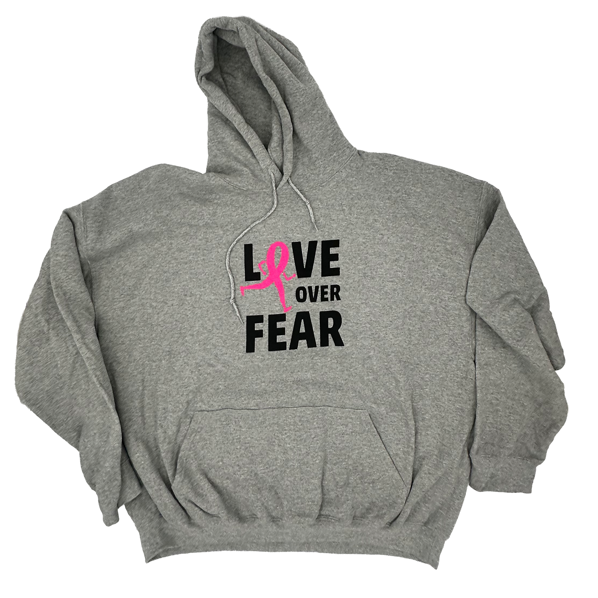 Cozy up in this ultrasoft grey hoodie designed for everyday comfort. A relaxed fit and mid-weight fleece make it perfect for training days, travel days, and everything in between — finished with The DONNA Foundation’s Love Over Fear mantra as a bold reminder of what fuels us.